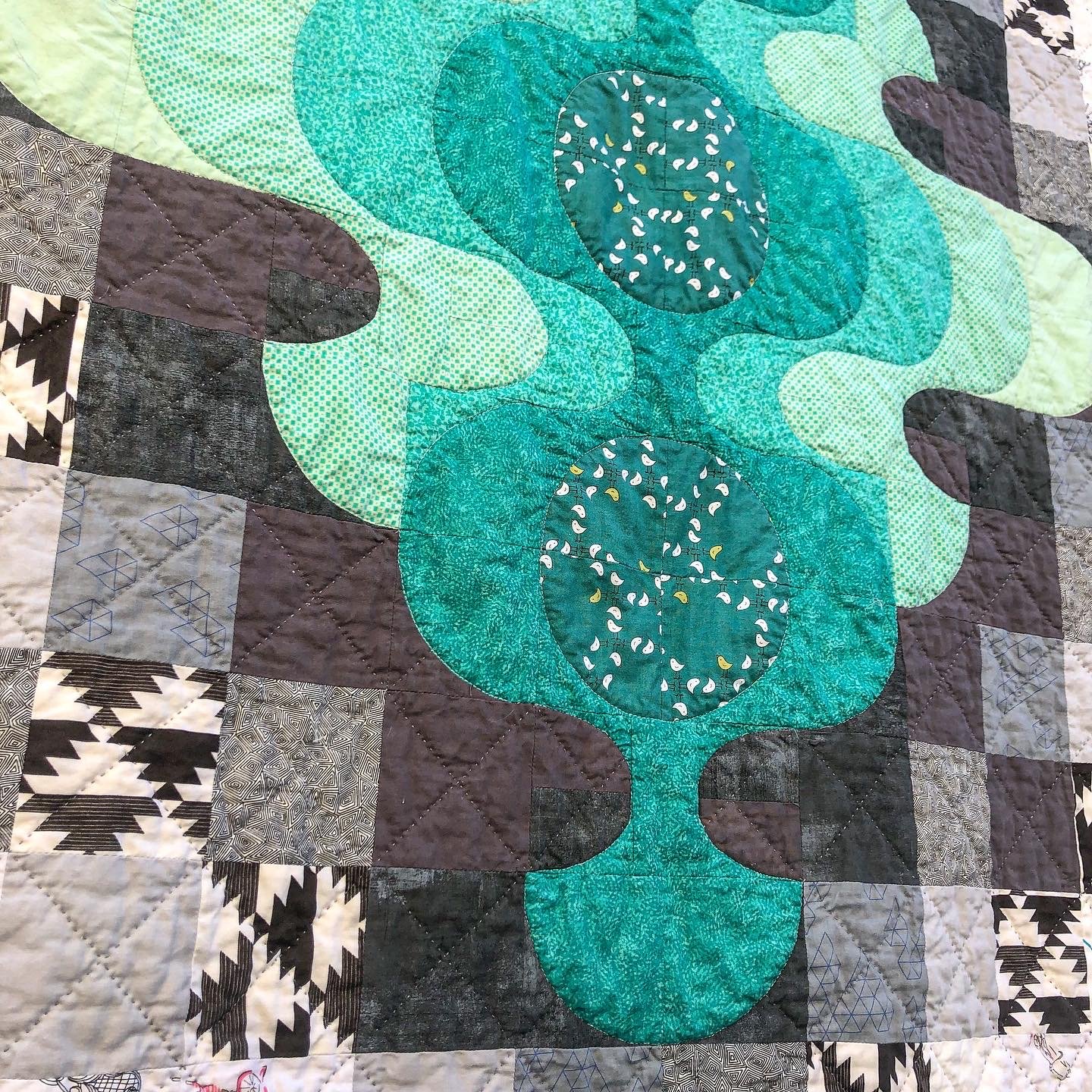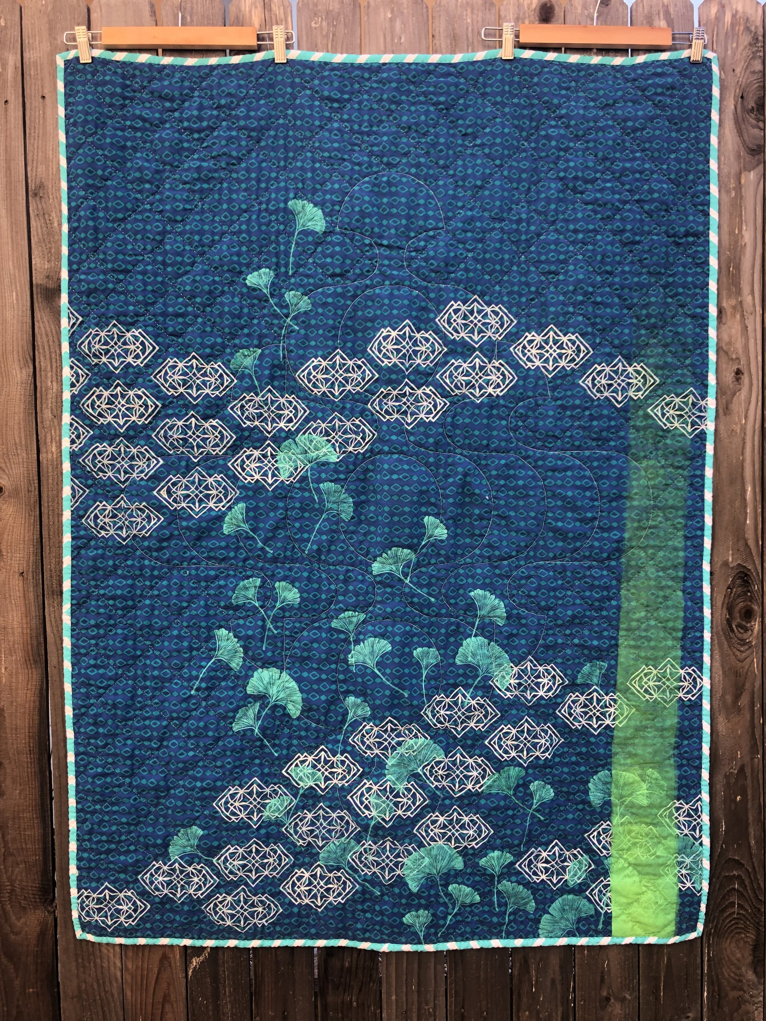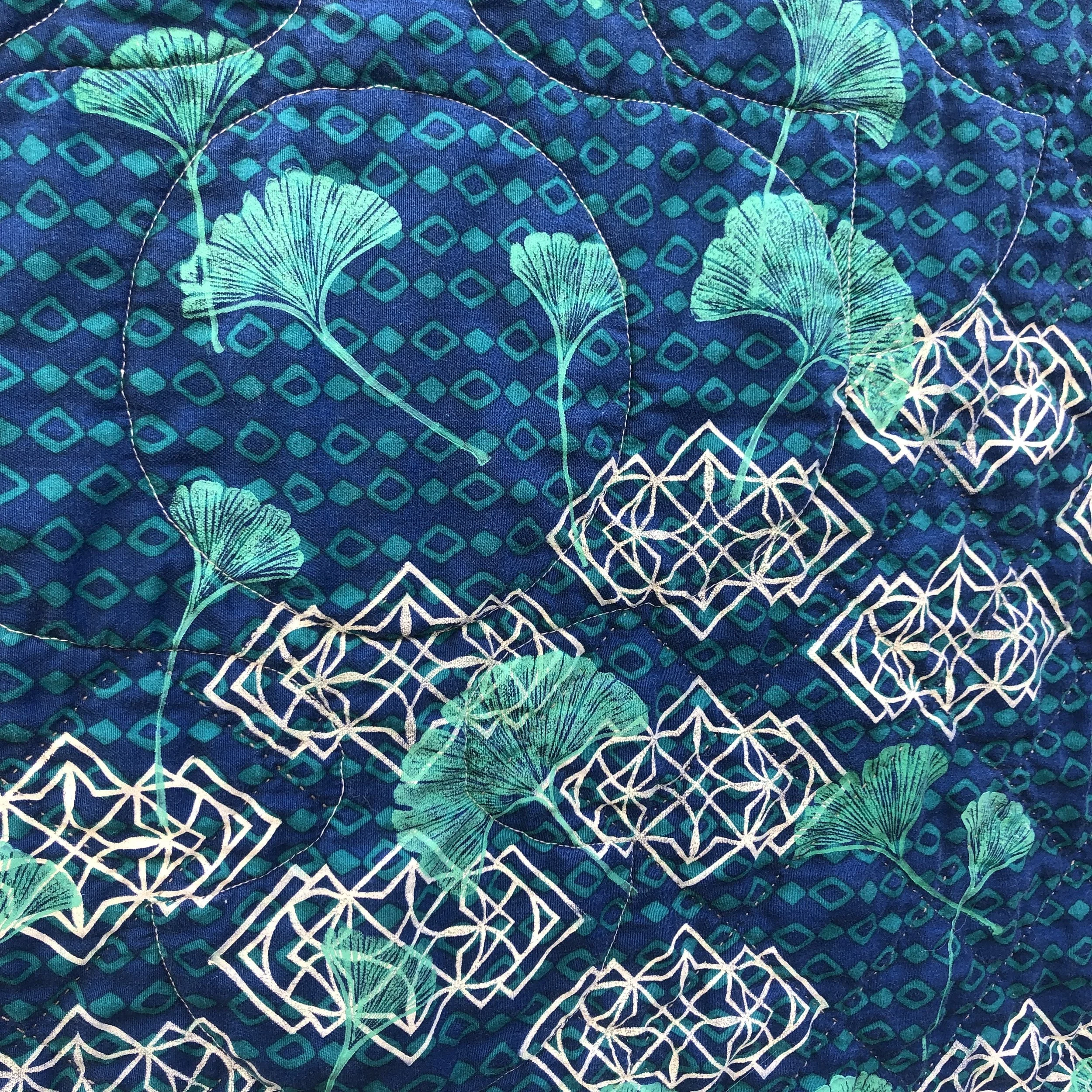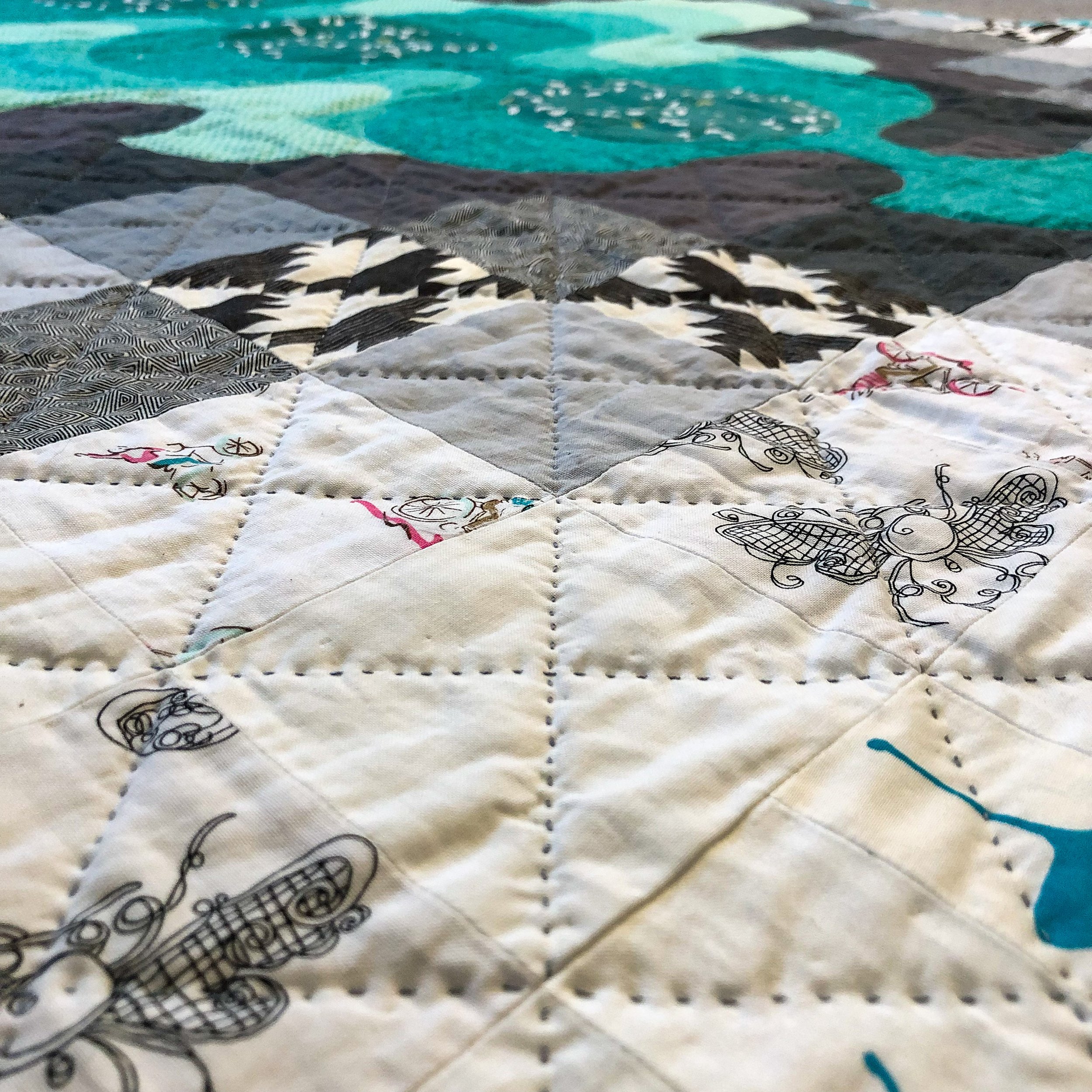 The waves and movement are echoed in this quilt with radial symmetry and decreasing color value as you move away from the center of the design. This quilt was entirely made from scraps, stash, or secondhand fabrics. I block printed onto thrifted fabric for the back of the quilt with my own designed and hand-carved blocks.