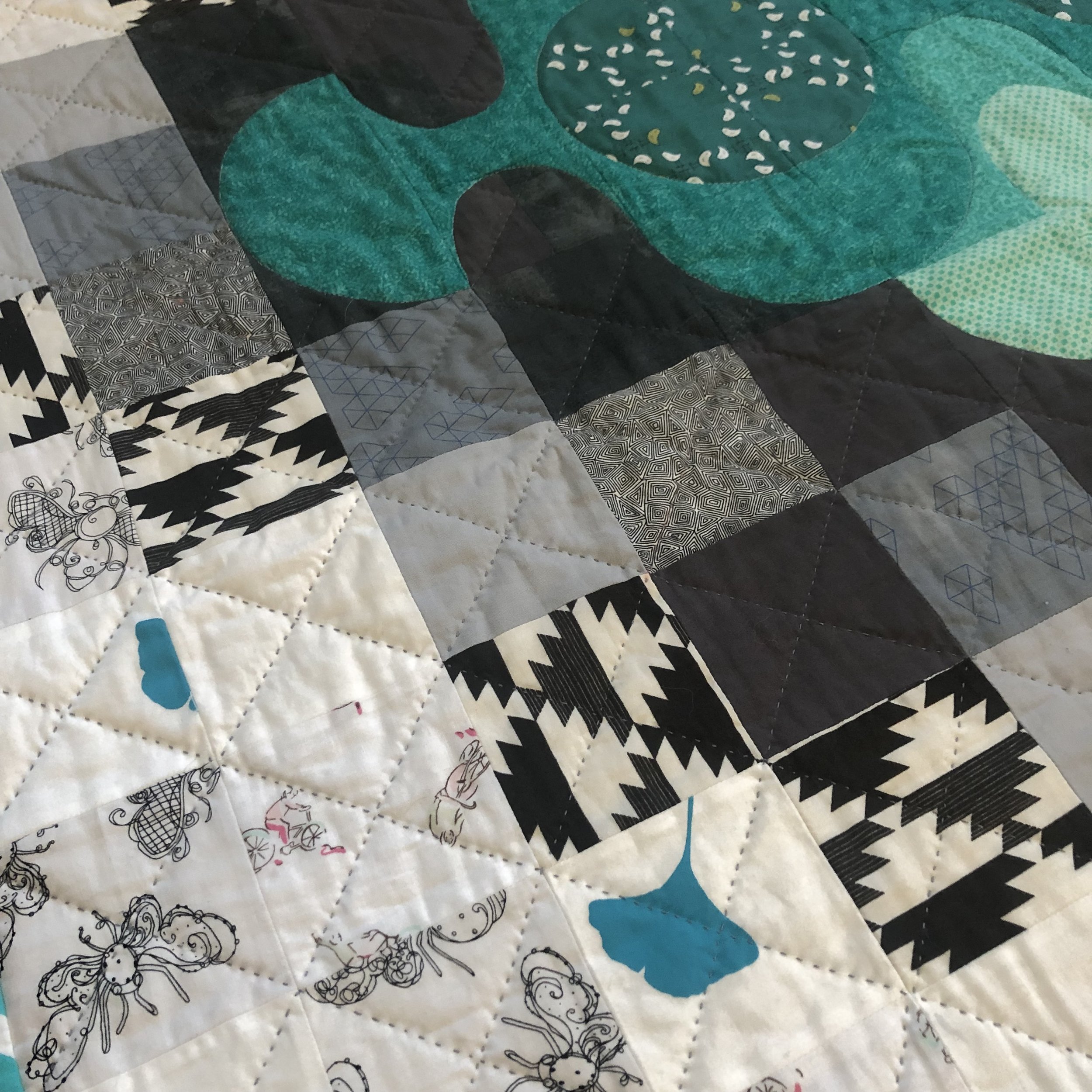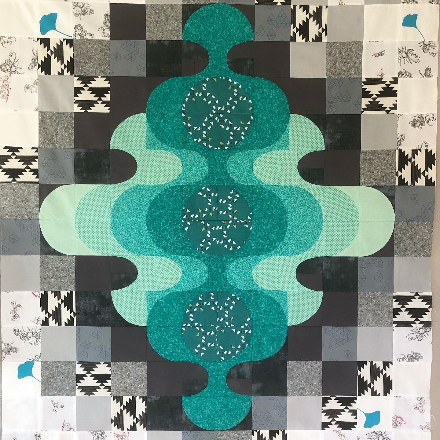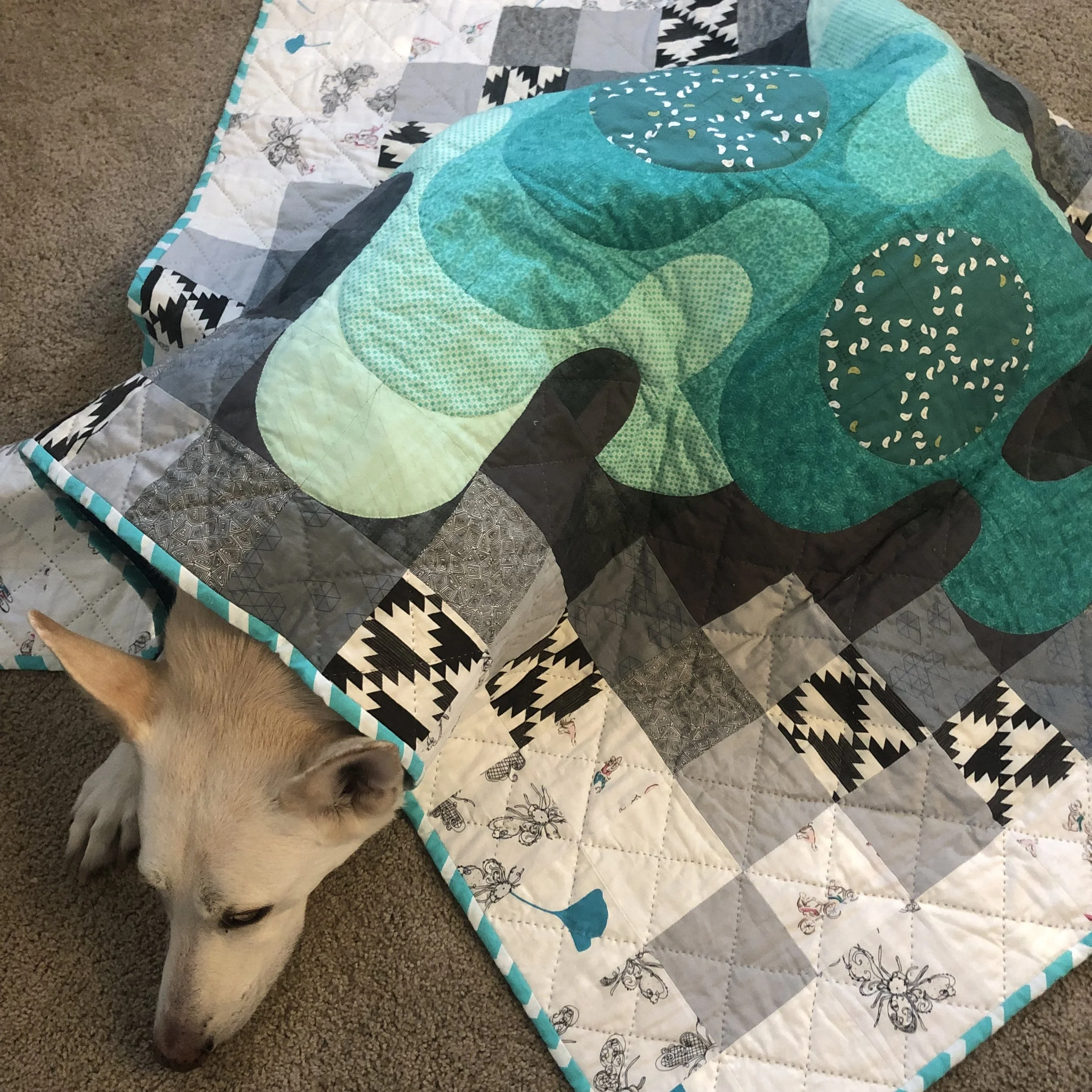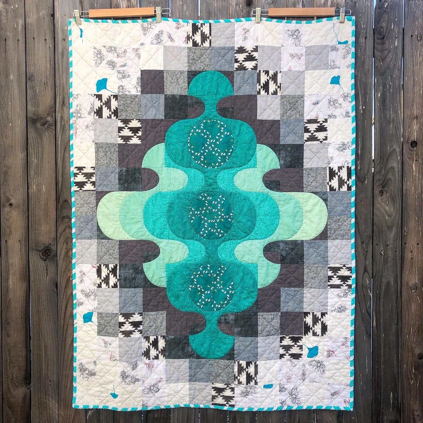 The waves and movement are echoed in this quilt with radial symmetry and decreasing color value as you move away from the center of the design. This quilt was entirely made from scraps, stash, or secondhand fabrics. I block printed onto thrifted fabric for the back of the quilt with my own designed and hand-carved blocks.